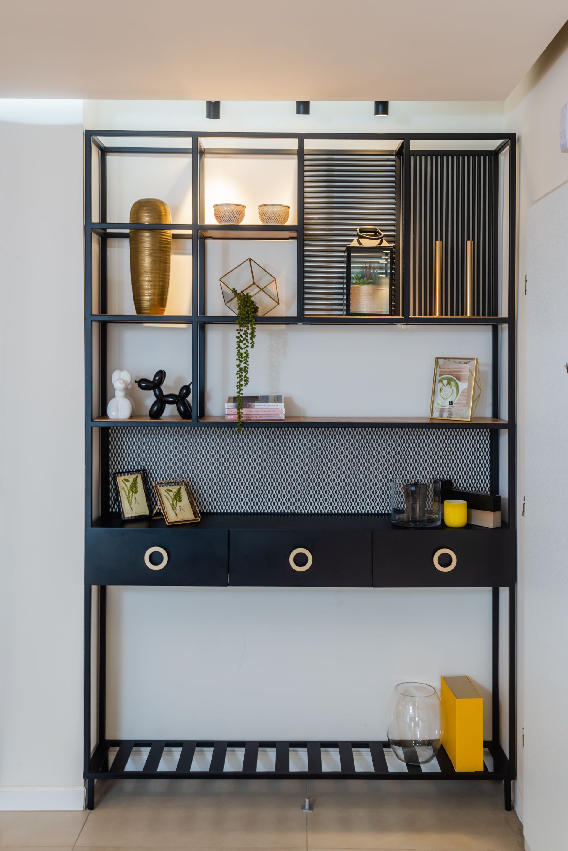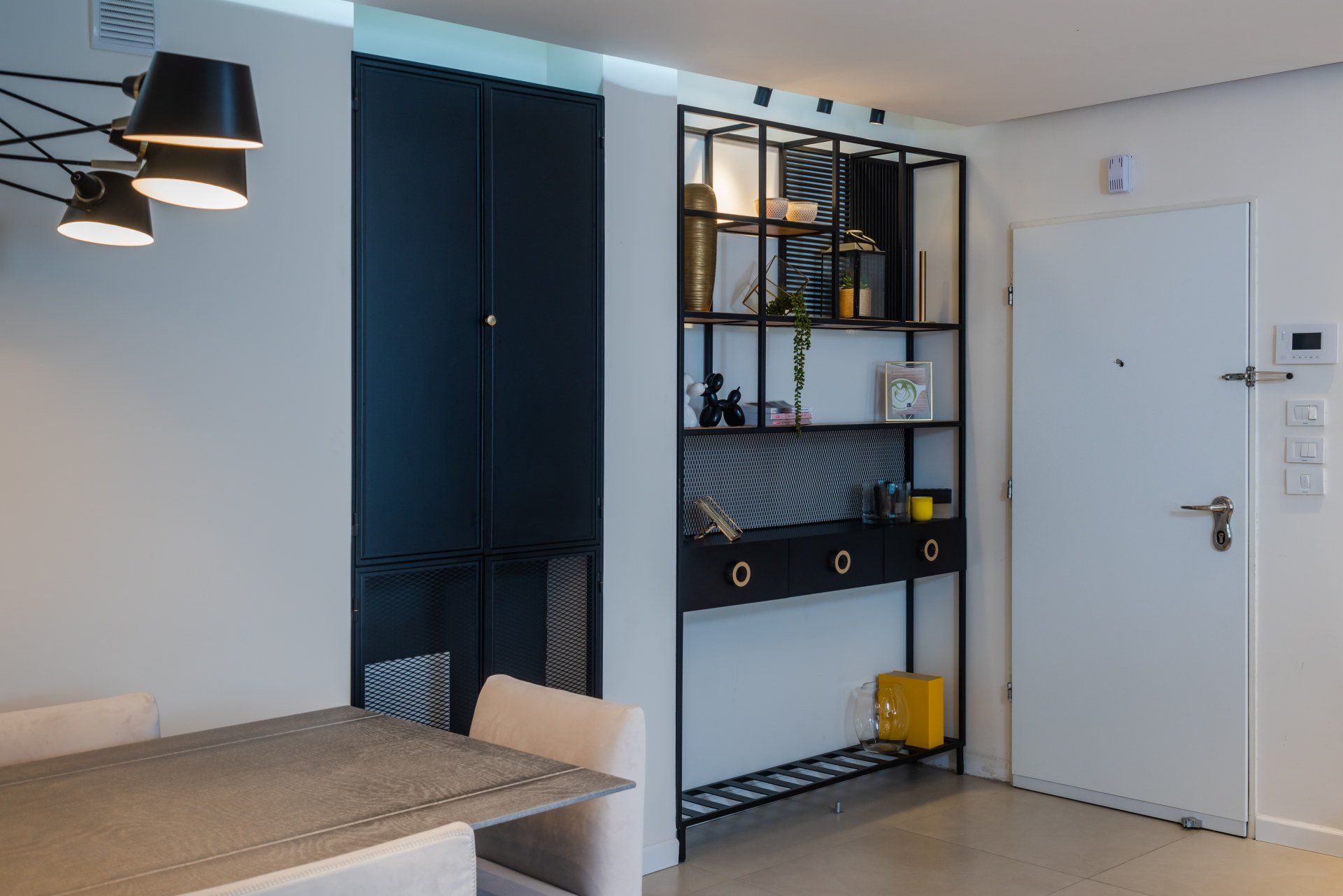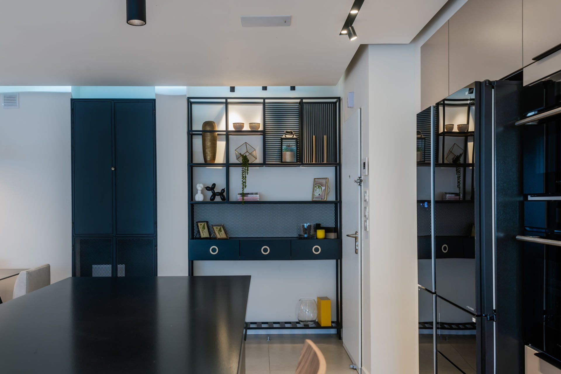 בקיר ארוך מימין לכניסה נקבע ארון התקשורת והחשמל, ועבר בו עמוד, שהיווה כיסוי לתשתיות הבניין. בניתי עמוד נוסף וכך יצרתי שתי נישות, ובתוכן מיקמנו שידות ברזל ("קיאנו" תל אביב), האחת לנוי, והשנייה, סגורה יותר, מסתירה את הארונות הללו, ומאפשרת גישה במקרה הצורך.