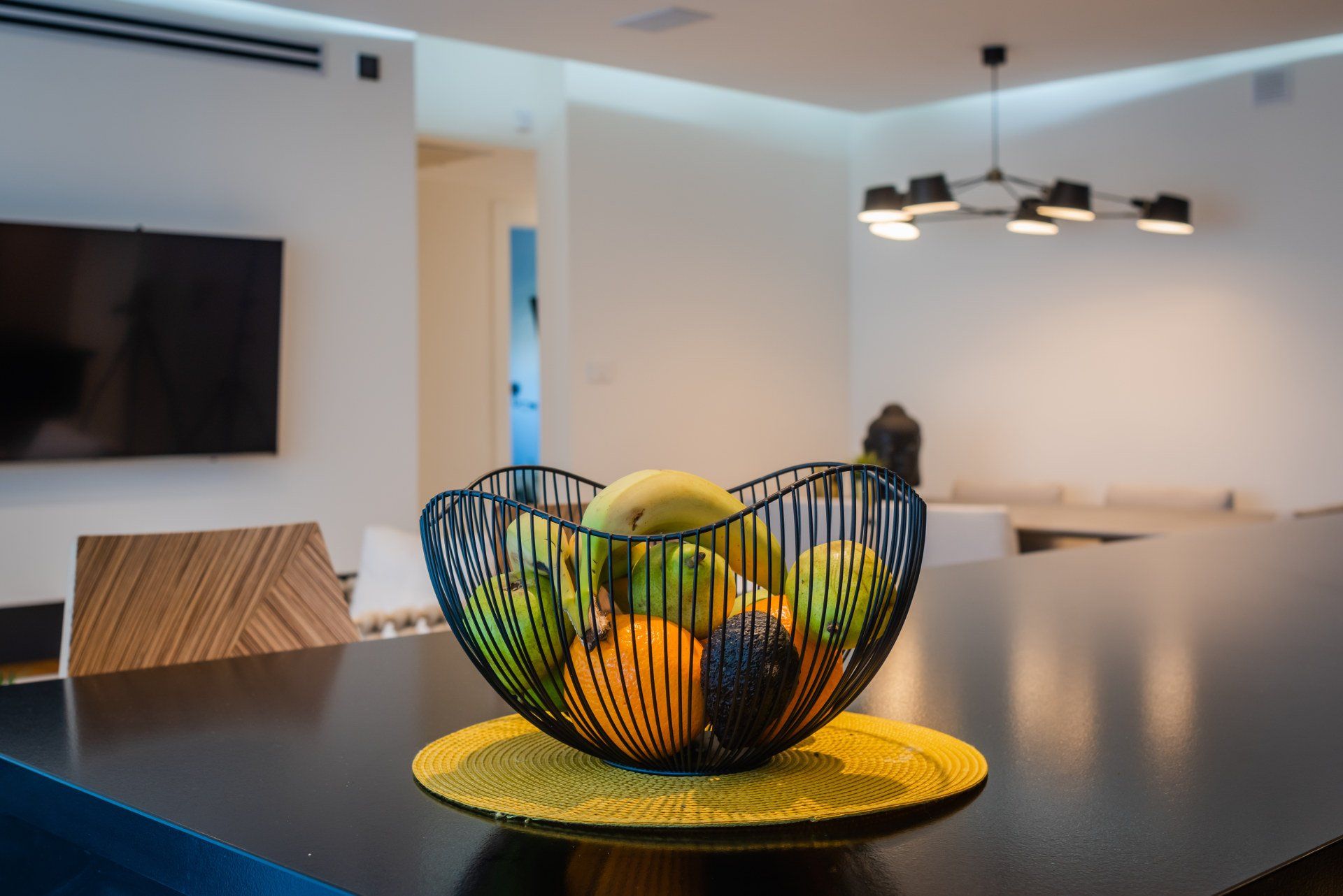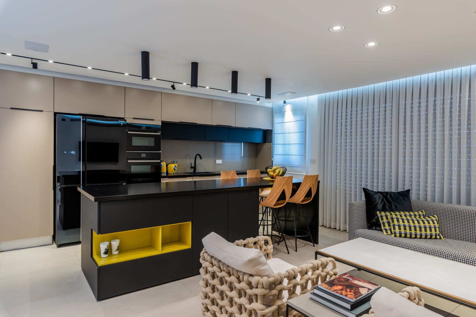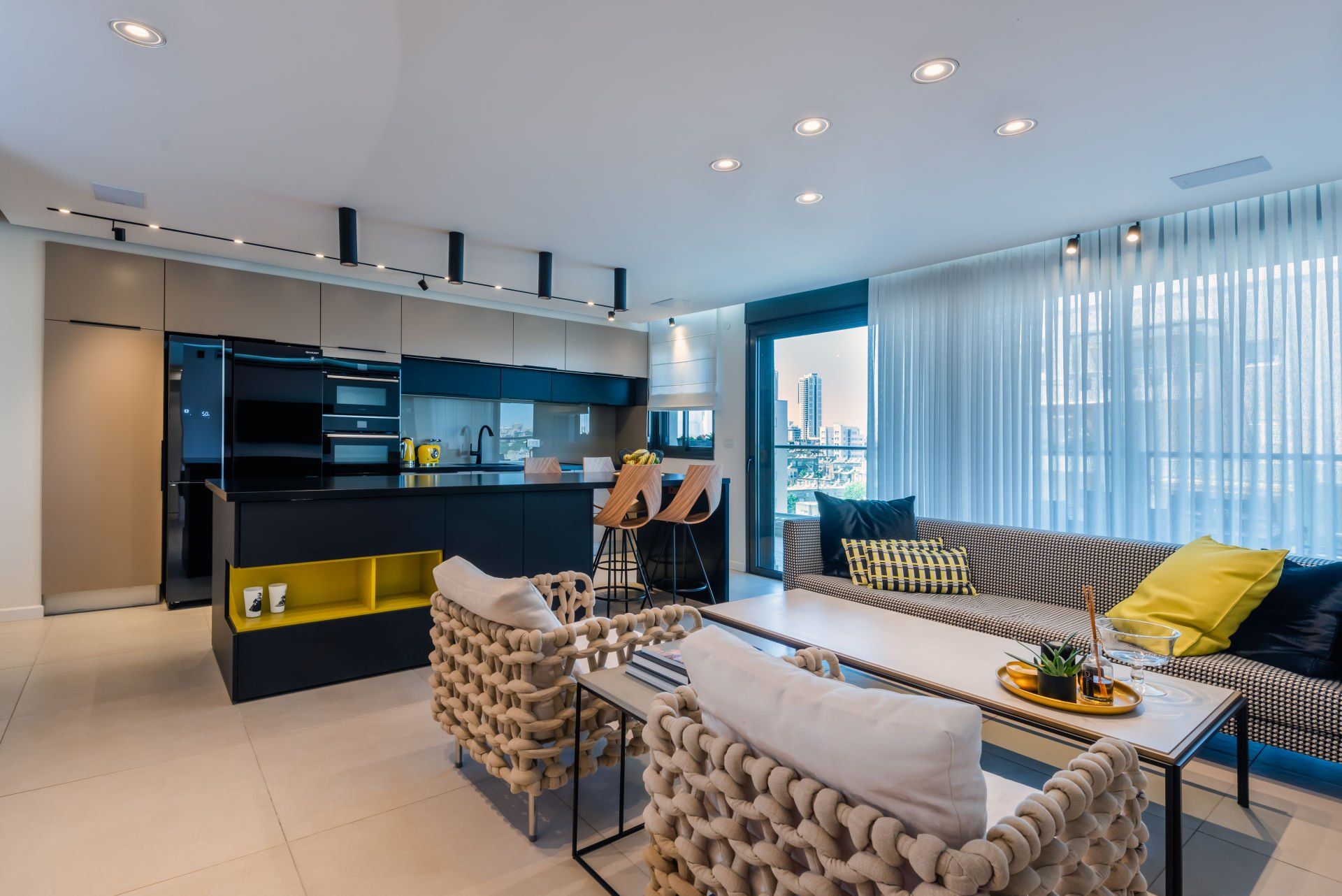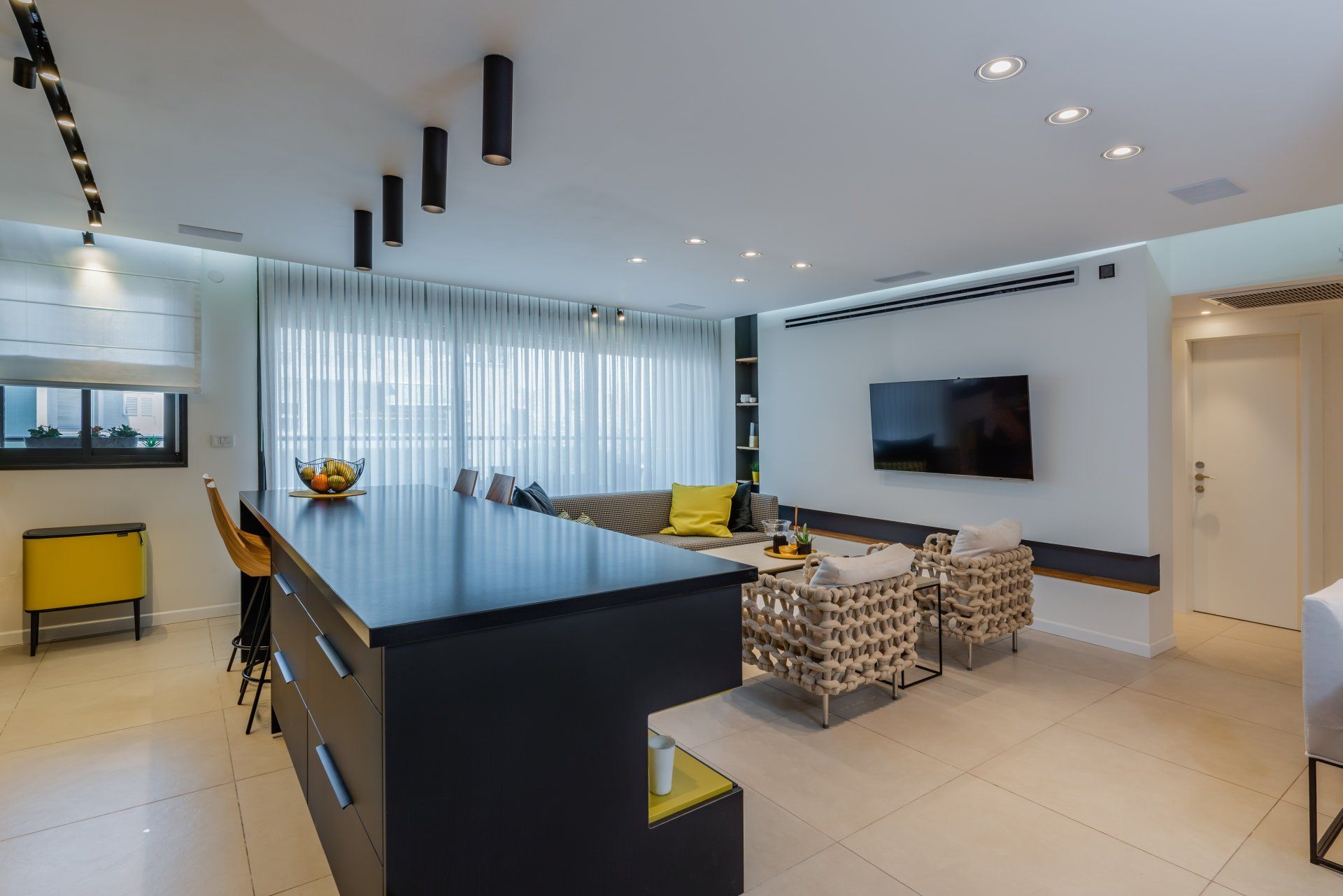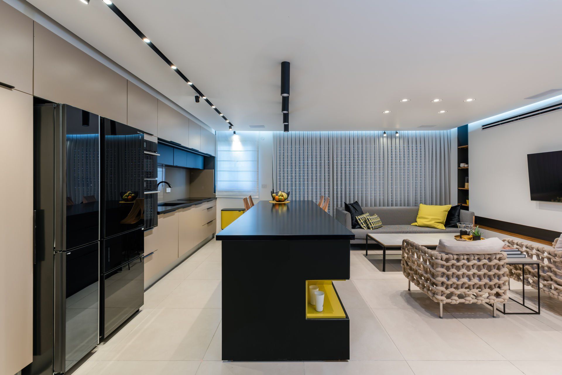 התחלנו בתכנון הדירה. החלל הציבורי אינו גדול, המטבח ממוקם כחלק בלתי נפרד מהסלון. בחנו מספר אפשרויות להעמדת המטבח והטלוויזיה, הצעתי מספר דרכים, ויעל בחנה מה מתאים לאורח חיי משפחתה. לבסוף נבחר תכנון של מטבח מקביל, וטלוויזיה ללא ספה בדיוק מולה.