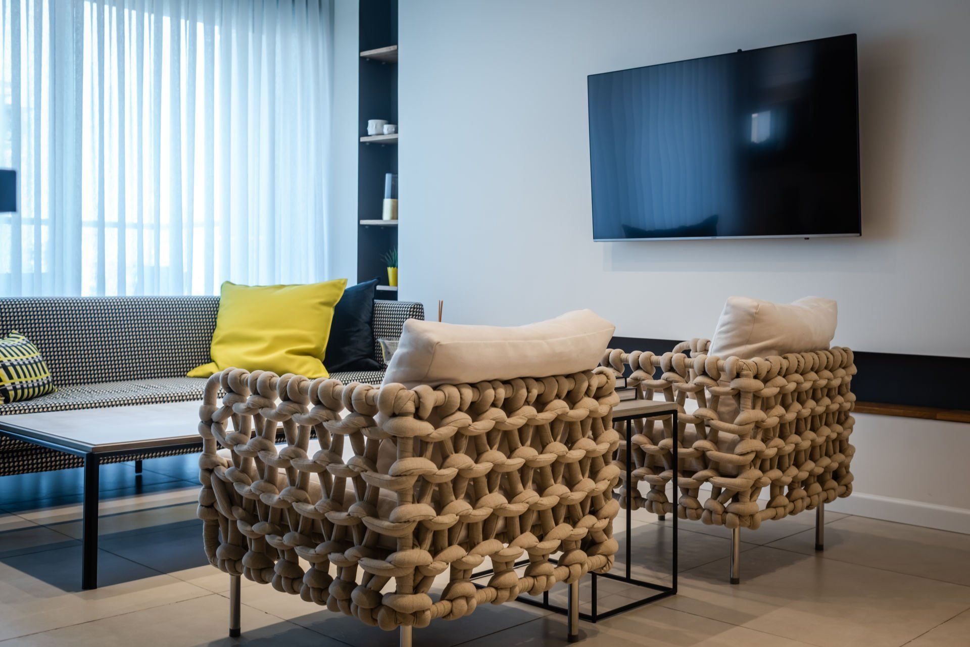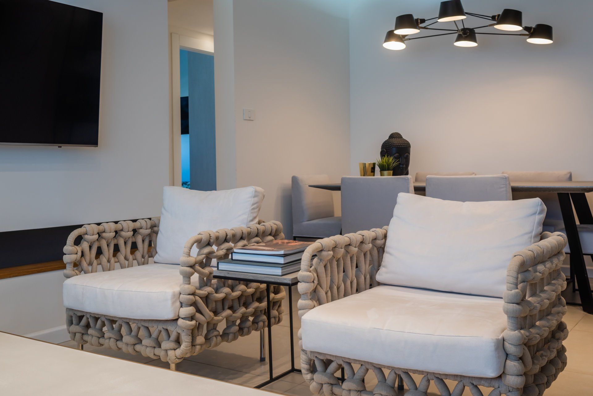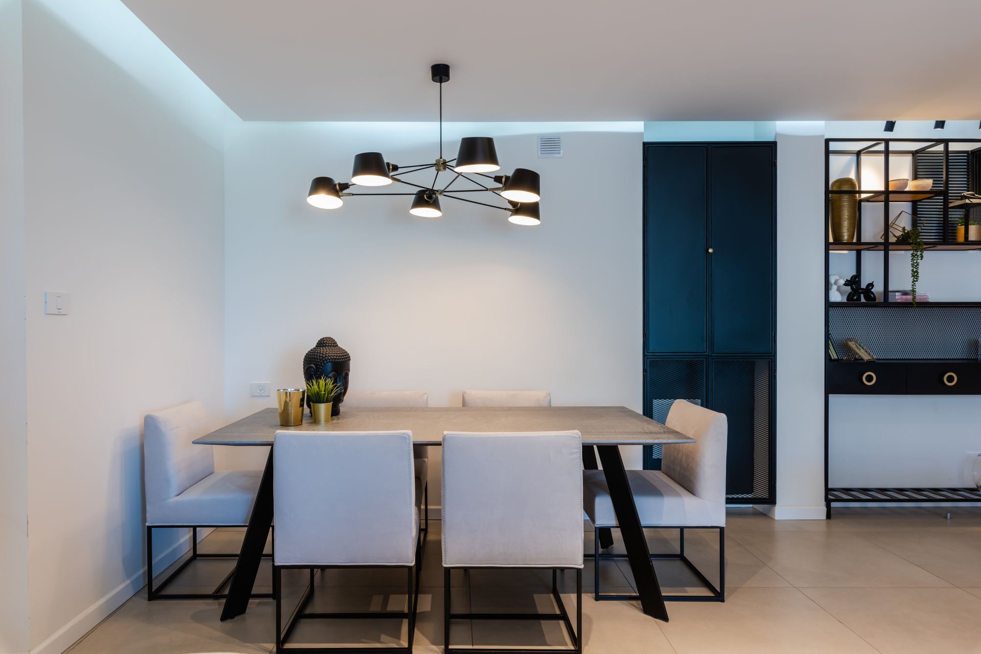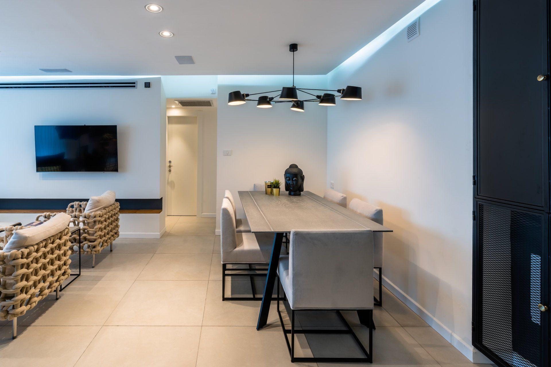 גם הריהוט ( "סיאם" הרצליה פיתוח), נבחר בגווני שחור-לבן, בז' טבעי, ושולחן צבוע אפור בטון במסגרת פליז מחממת.