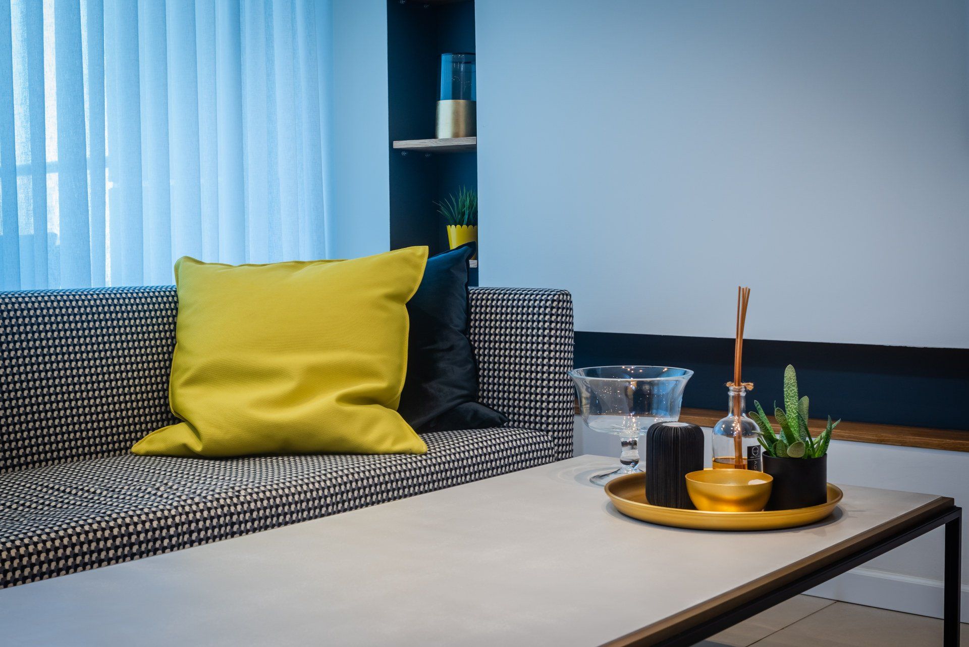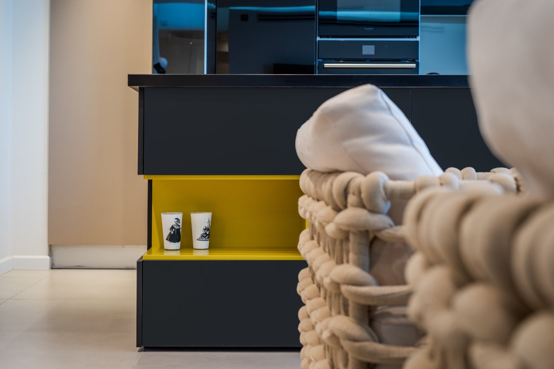 הריצוף המקורי של הקבלן הוחלף בגרניט פורצלאן אפור, חתוך בגודל 80/80. ריצוף קובע את אופי הבית, ככל שהחלל קטן יותר כך עדיף לבחור ריצוף גדול יותר, שיוצר אשליה של מרחב. כדי ליצור אווירה חמה, אך לא כפרית, בחרנו למטבח (רגבה) חזיתות מודרניות בגוון קפה, שחור, ו"עקיצה" בצהוב.