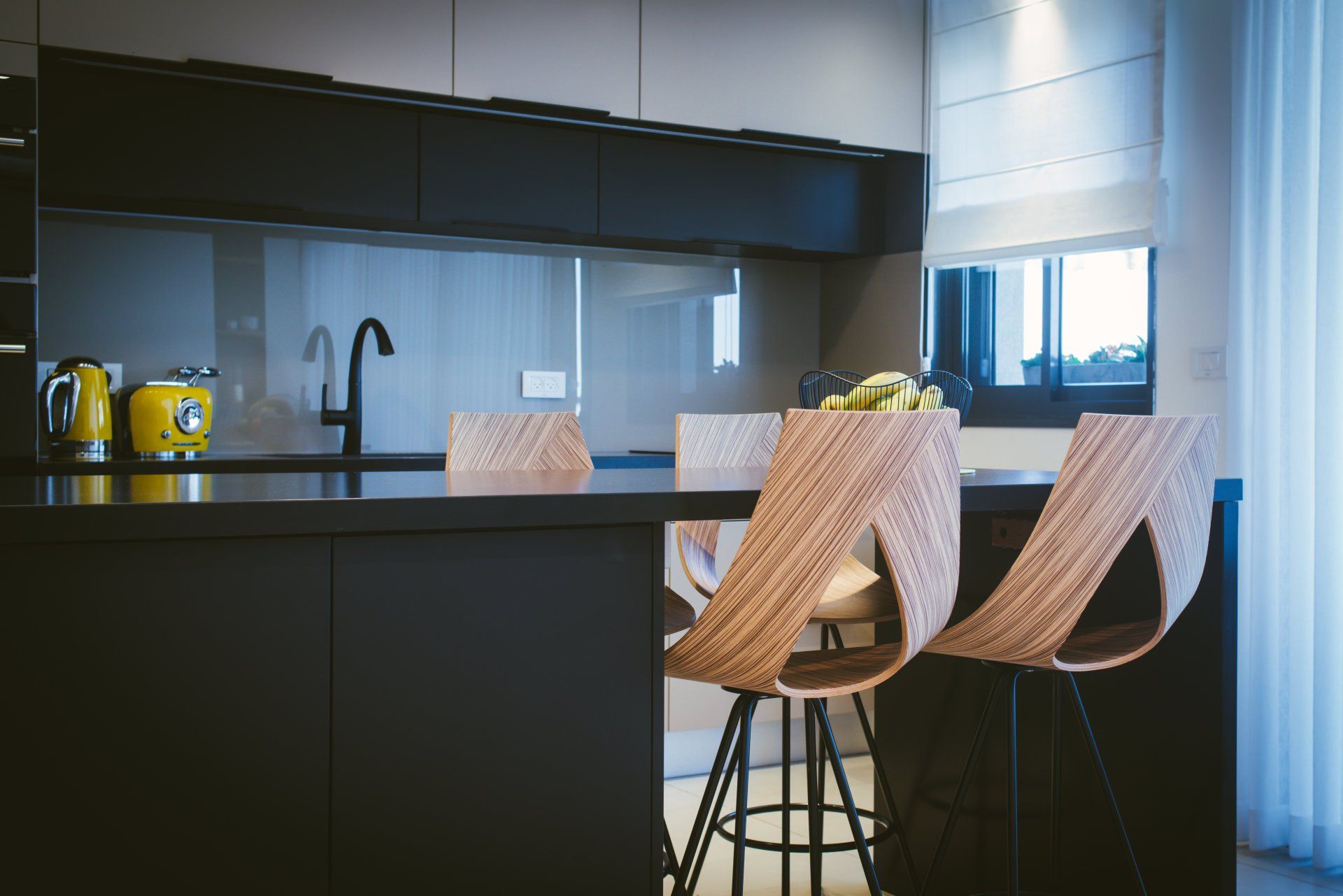 כיסאות הבר מעץ, בעיצוב מודרני, מכניסים אף הם חם לחלל המודרני.
