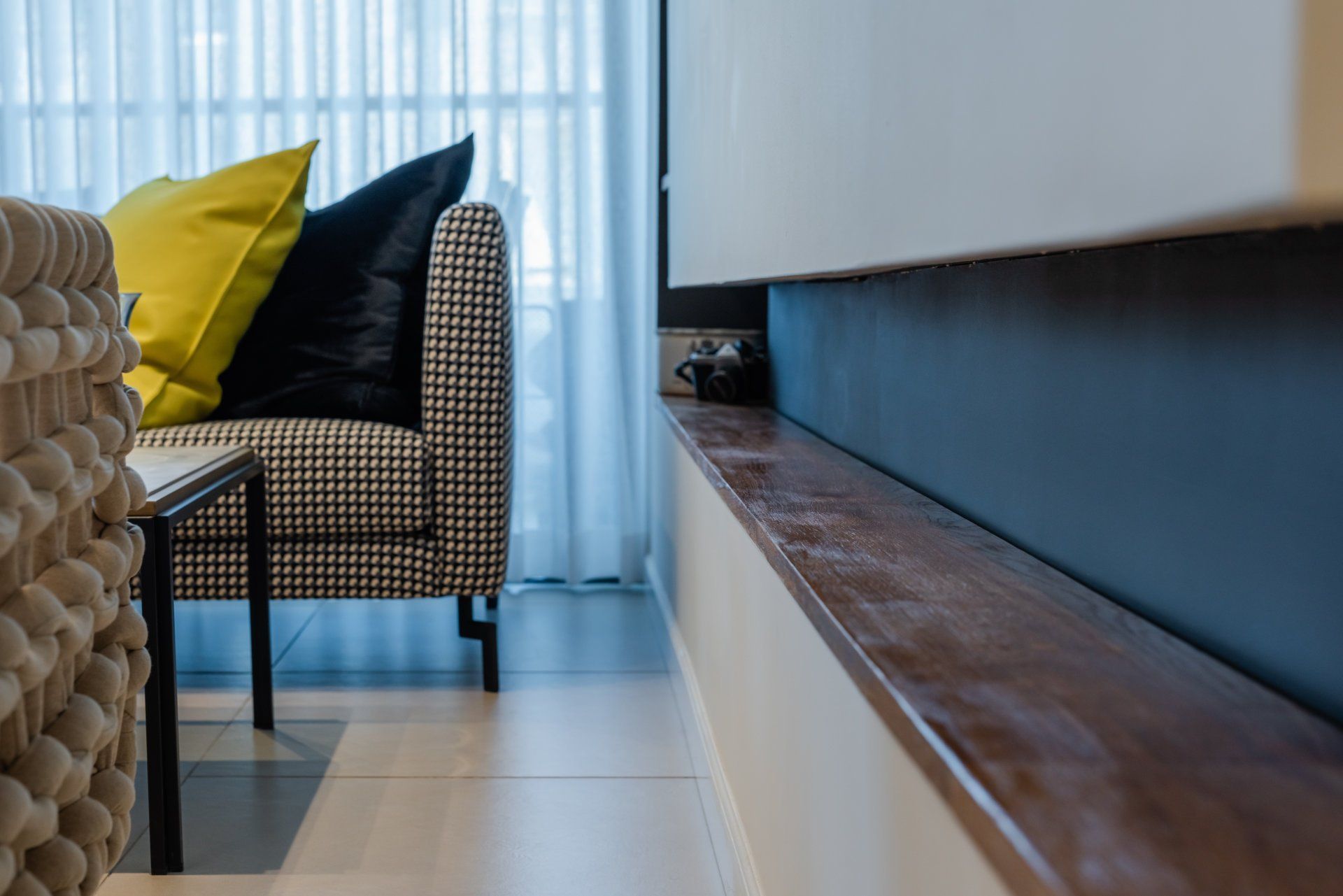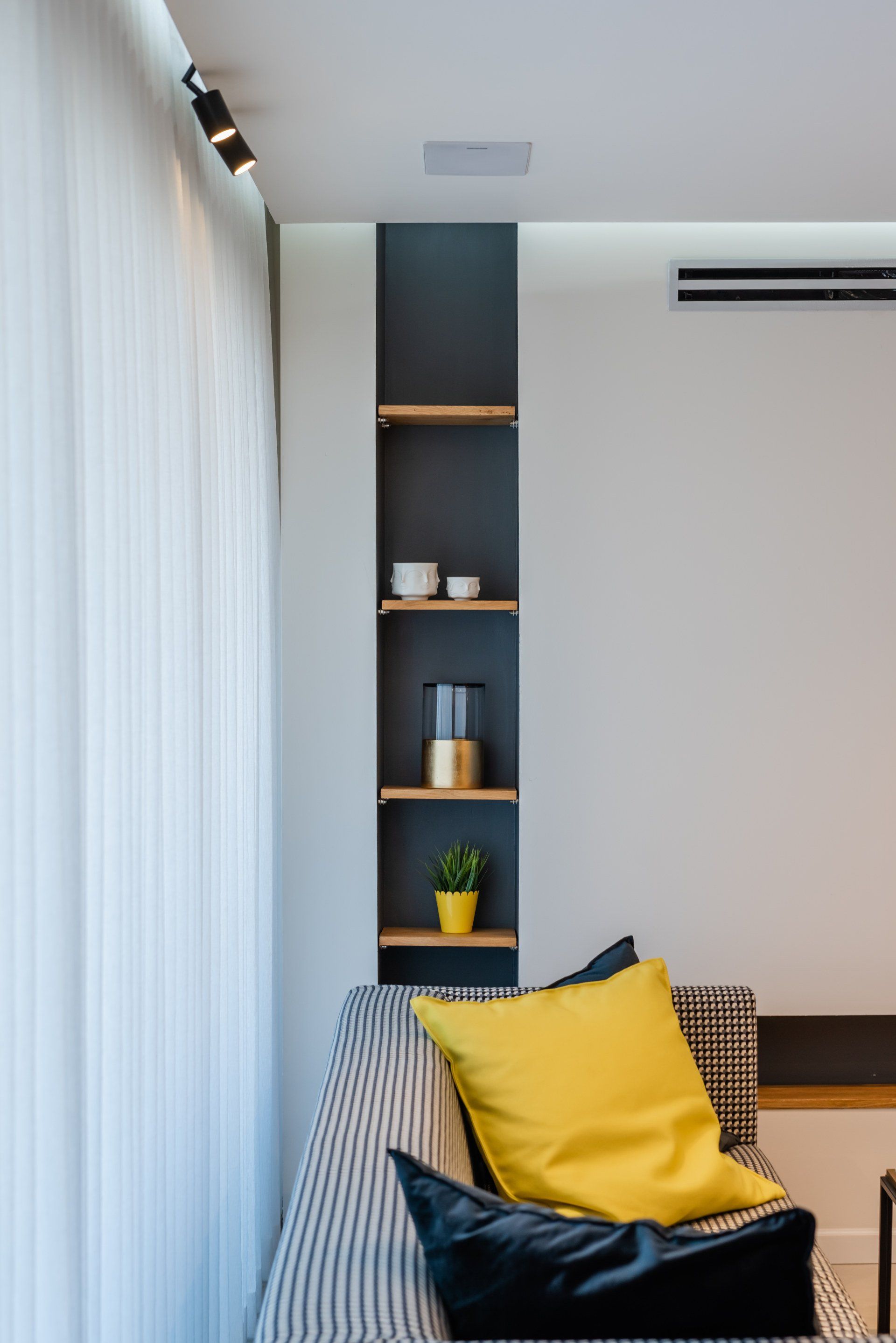 קיר הטלוויזיה עובה, כך שנוצרה נישה ארוכה, שחופתה במדף עץ. החיווט מוסתר בקיר המעובה.