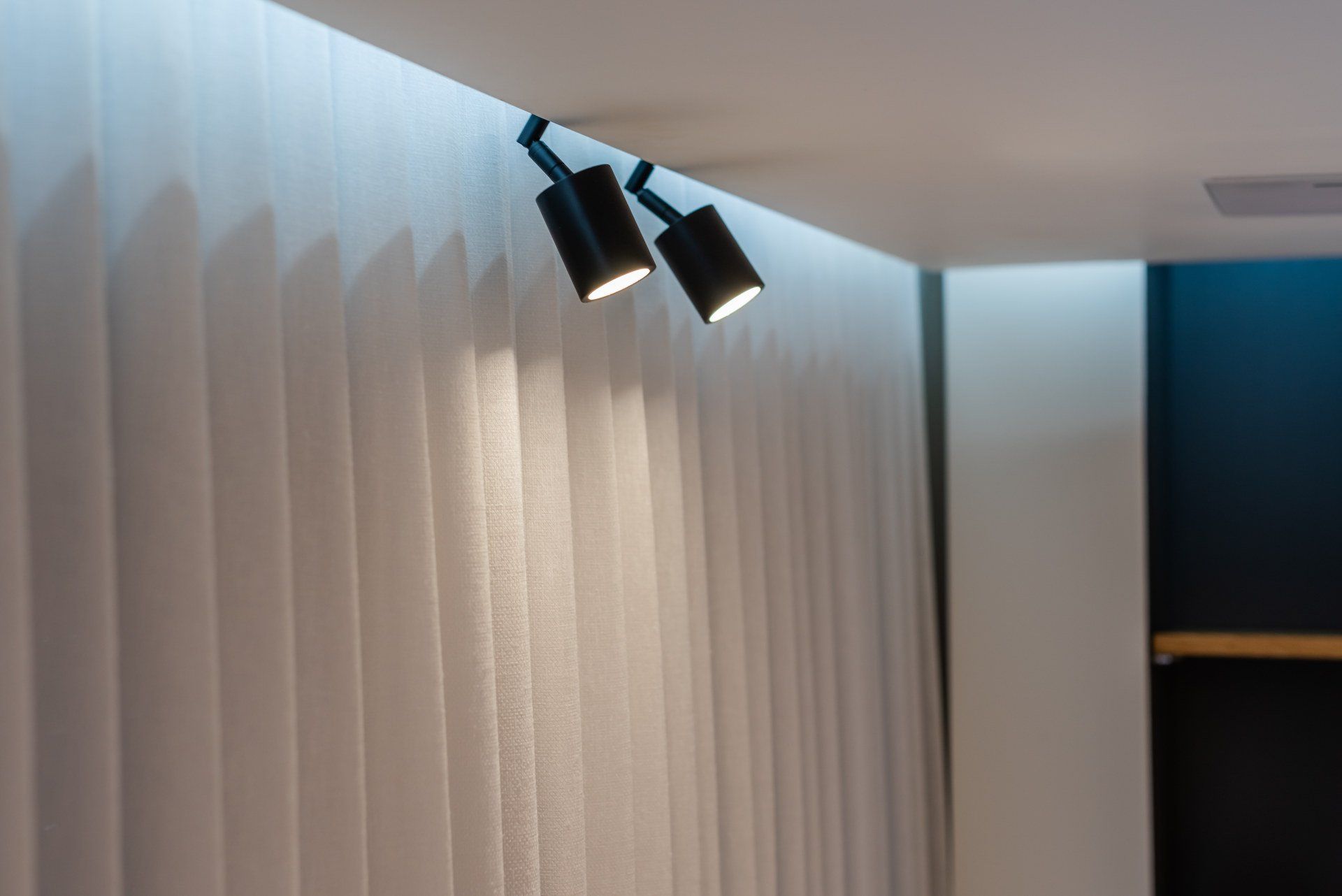 ראשית נבנתה תקרת גבס צפה, שמסתיימת בפרופיל מיוחד, שמדקק את קצוות התקרה. בתוכה שולבו גופי תאורה שונים, פסי צבירה עם ספוטים במטבח, שקועים בסלון, ספוטים מציצים מהתקרה לכיוון שידות הברזל, והווילונות, וגוף תאורה אחד שתלוי מהתקרה מעל פינת האוכל. התאורה תוכננה כך שניתן לשלוט בתאורה של כל אזור.