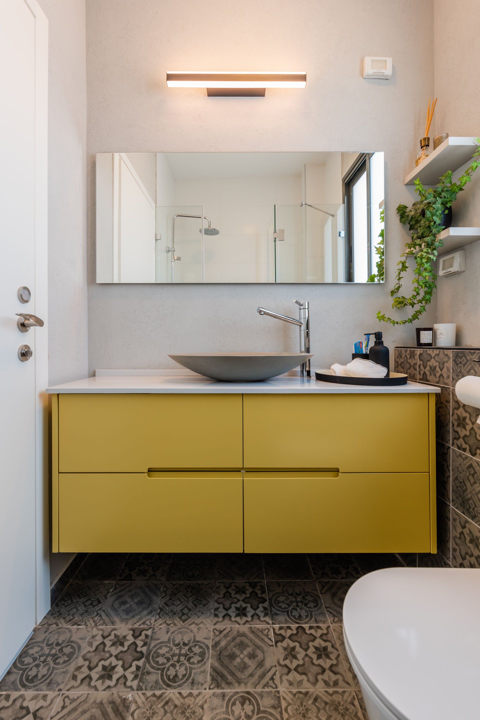 בחדרי רחצה הורים מופיע הצהוב, משולב באריחים אפורים מצוירים שמכניסים חום, ובחדר רחצה ילדים, נבחרה רצפה פרחונית משהו, בגווניי מוקה. (נגרות ארונות- "דני הנקר").